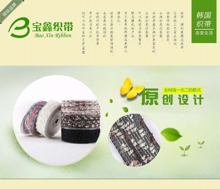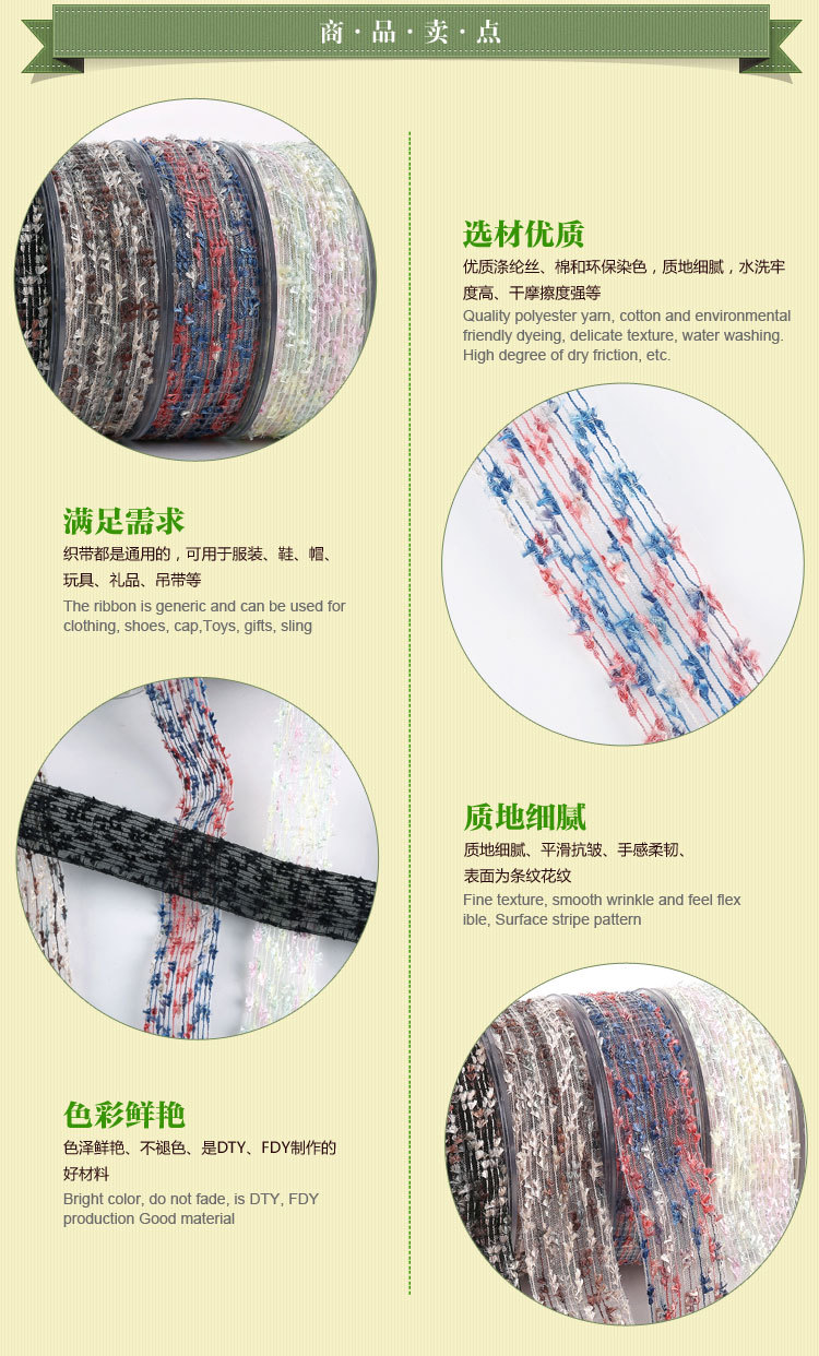 主營產(chǎn)品:提花織帶,韓國織帶,編織帶,仿尼龍織帶,緞帶/羅紋帶,子母織帶,熱轉(zhuǎn)印織帶,間色織帶